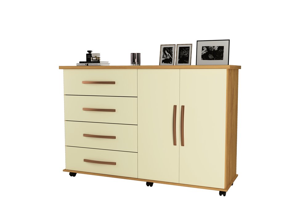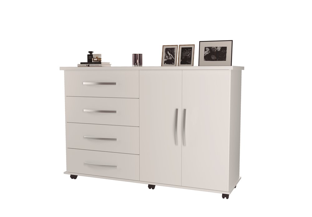 Cômoda Bali merece ter um cantinho especial aí na sua casa. Charmosa e discreta, ela oferece dois tipos diferentes de compartimento: as portas e as 4 gavetas ajudam na organização de peças dobráveis, roupa íntima ou outros acessórios que adicionar à arrumação.